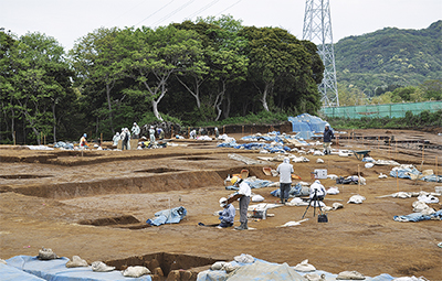 船久保遺跡は三浦半島の西側、小田和湾を見渡せる標高30〜40mの丘陵地に位置。旧石器から弥生時代の遺跡で2013年の春から発掘調査が行われ、今年が最終年度となる。