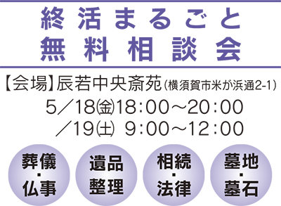地元葬儀社の辰若では5月18日(金)・19日(土)の両日、終活に関する情報提供を目的とした無料相談会を開く。葬儀内容や費用のこと、墓地(墓石)に関する悩み、遺品整理、相続対策など幅広い領域の相談や困りごとに各分野の専門家がアドバイスを行う。情報収集の場として気軽に参加できる。