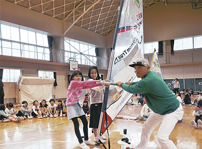 津久井小学校で今月8日、全児童が参加する体験教室が開かれた。講師を務めたのは、地元の海を活動拠点とする香村治彦、長谷川篤の両プロ選手。体育館にボードとセイルを持ち込み、風を推進力にする原理や競技について説明を行った。ボードに立ち、セイルを手にして風を流して走るイメージ体験もあった。