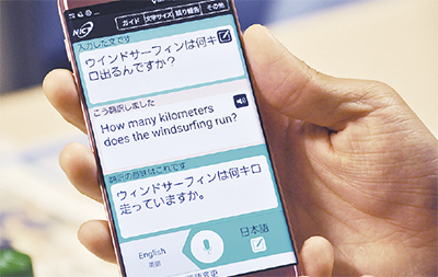 津久井小と北下浦小の5・6年生は、大会会場を訪れて海外選手と交流する。総合学習の一環。32カ国の出場選手の言語や生活様式などを学んで質問する。実際の場面では、国立研究開発法人情報通信研究機構(NICT)が開発した音声翻訳アプリ「ボイストラ」=写真=を使用する。スマートフォンに言葉を吹き込むと即座に翻訳。31言語に対応している。ワールドカップ実行委員会から両校に本体が貸し出されており、11日に津久井小、15日に北下浦小が行う。