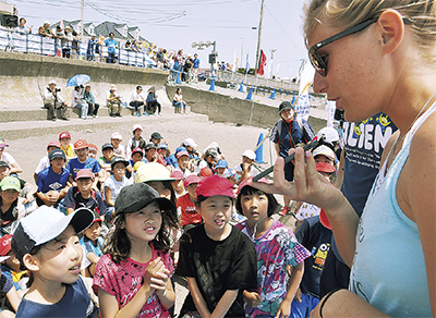 「あなたにとってウインドサーフィンとは何ですか?」。フランスから来日したデルフィーン・クザン選手に女子児童が質問すると、「人生をかけた挑戦。ライフスタイルそのもの」との答えが返ってきた。