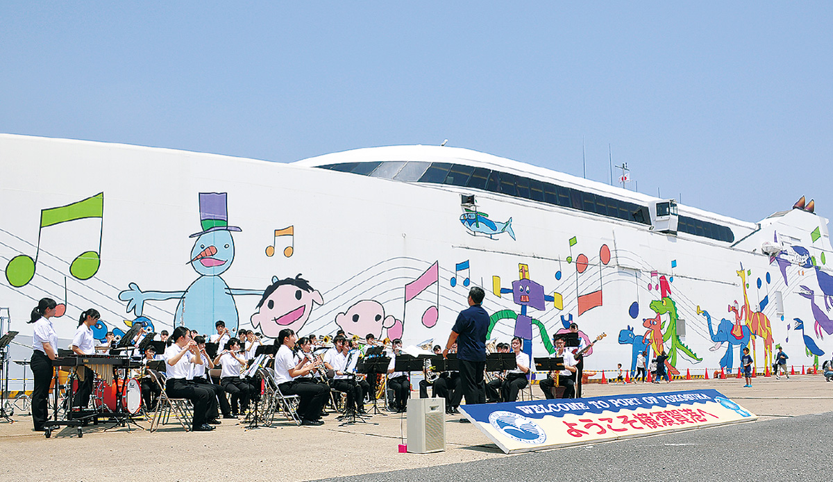2つの船を並べたような胴体構造が特徴の双胴型高速フェリー「ナッチャンWorld」が先月25日、久里浜港に8年ぶりに寄港した。27日には船内を見学できる開放イベントが催され、カメラを手にした見物客など約6500人が集まった。子どもや動物のイラストが描かれた船体の前で三浦学苑高校の吹奏楽部が歓迎演奏を披露した。