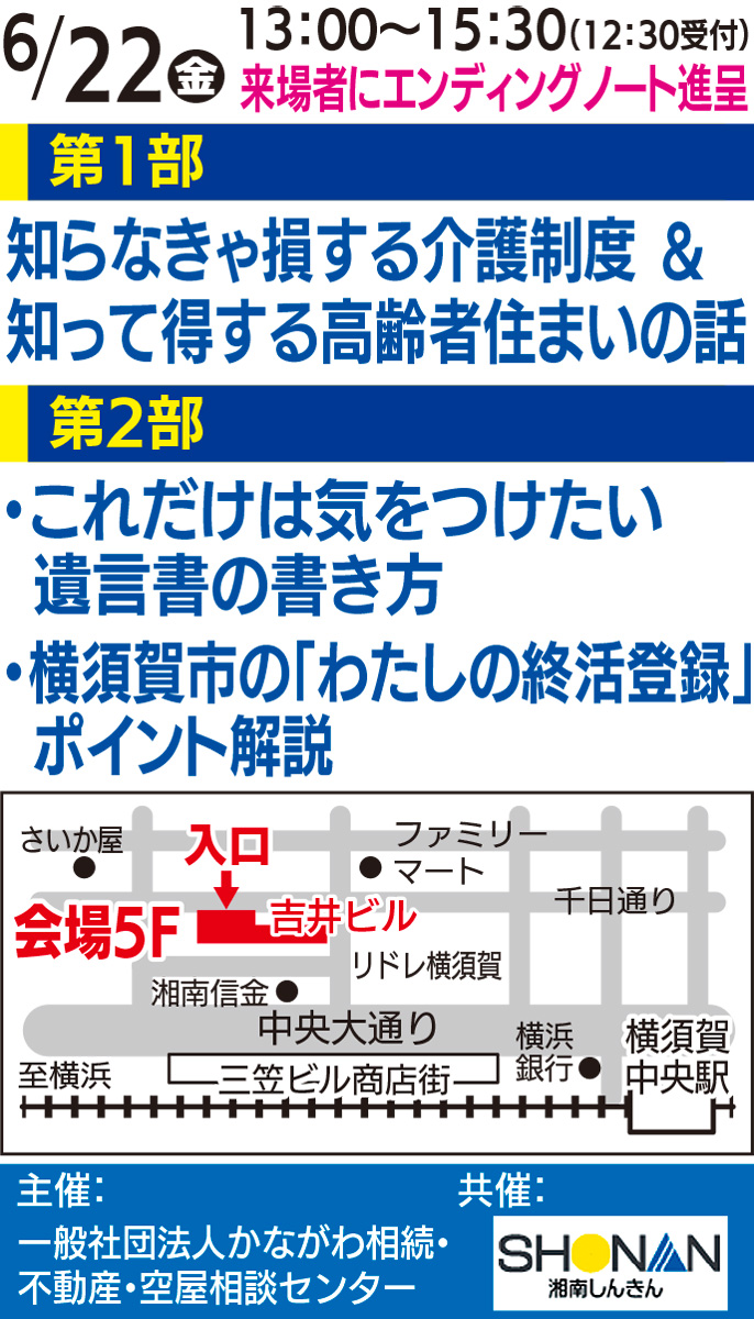 相続・空き家・不動産・高齢者住宅などに関わる各分野の専門家グループ「一般社団法人かながわ相続・不動産・空家相談センター」では湘南信用金庫共催のもと6月22日(金)、大滝町の同金庫本店別館5階で終活セミナーを実施する。