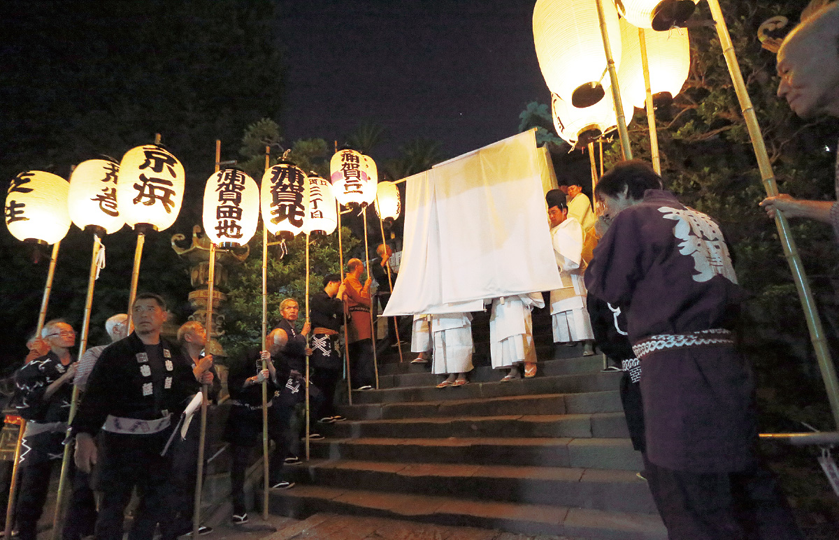 西浦賀の西叶神社で今月2日夜、176年ぶりとなる本殿の大改修復工事に伴い、ご神体を仮殿にうつす神事「仮殿(かりでん)遷座祭(せんざさい)」が大勢の見物客に見守られながら執り行われた。約50人が参列。高張提灯を掲げ、松明の明かりと雅楽の演奏に合わせて参道を静々と進んだ。同神社の感見達也宮司は「絹垣」と呼ばれる白い絹の布でご神体を囲むようにして仮殿となる社務所へ運んだ。