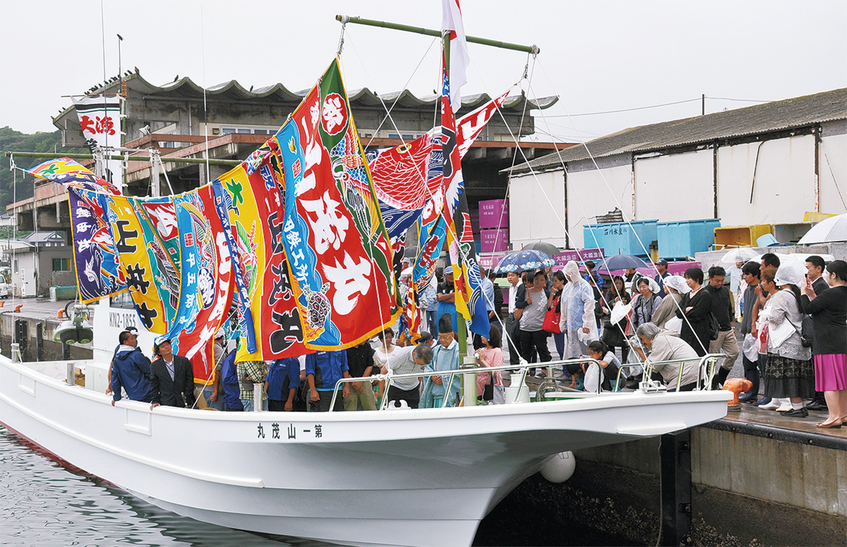 赤や青といった約20枚の色鮮やかな大漁旗が飾り付けられた船の前には、大勢の地元住民や漁業関係者らが集まり門出を祝福した。進水式では神主による安全祈願の後、恒例の「餅まき」が行われ船上から岸壁に向け、餅や菓子が投げられ賑わいを見せた。