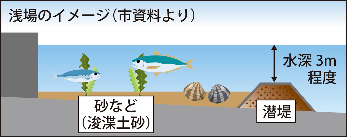 計画見直しにより、整備エリアをアイクルの東側面から南側に変更。工事期間は今月半ばから10月末ごろで、土砂を投入するほか、流出防止のため、水深3m程度に潜堤を築造する。造成後の利活用について以前の計画では、直接海に親しめる場として、環境学習や潮干狩りなどを想定しているが、潮の流れや砂の定着などの様子を見ながら、具体的な利用方法を検討していくという。