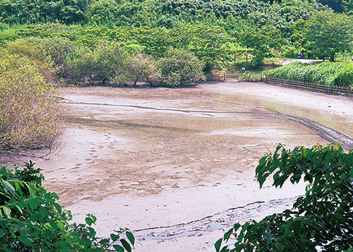 会場は横須賀市の里山モデル地区となっている長坂の沢山池。農業用水としての役割を担っていた最大水深9mの人工池の水を抜き、水生生物を観察しながらアメリカザリガニの駆除を行った。