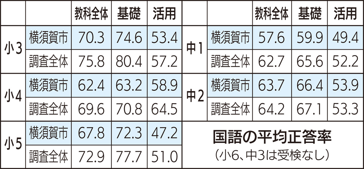 横須賀市教育委員会は先月27日の定例会で、「市立小・中学校学習状況調査」の結果を報告した。今年4月に小学校3〜6年生、中学校1〜3年生を対象に実施したもので学年・教科別の正答率と全国で同じ問題を受検した児童生徒の比較では、平均値を下回る教科が大半だった。国語に関しては、「書くこと」への課題が見られた。