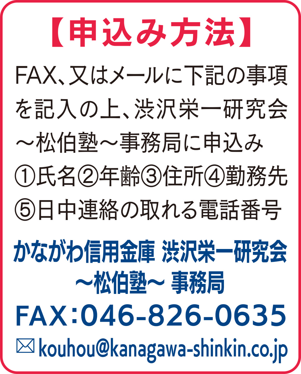 渋沢研究をライフワークとしている同金庫の平松廣司理事長が講師を務める。初回となる9月11日(火)は「『論語と算盤』と現代の経営」をテーマに、渋沢の足跡とその精神を解説する。地域密着の経営を実践する自身の考えなども語る。
