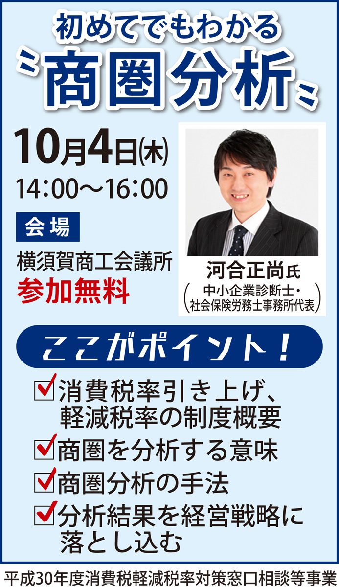 横須賀商工会議所では10月4日(木)、「初めてでもわかる”商圏分析”」と題した経営セミナーを開く。商圏の設定方法や潜在ニーズの捉え方などをマーケティングの専門家である河合正尚氏がわかりやすく解説。分析を行うための手法やツールの活用も指南する。消費税軽減税率制度の説明も行う。