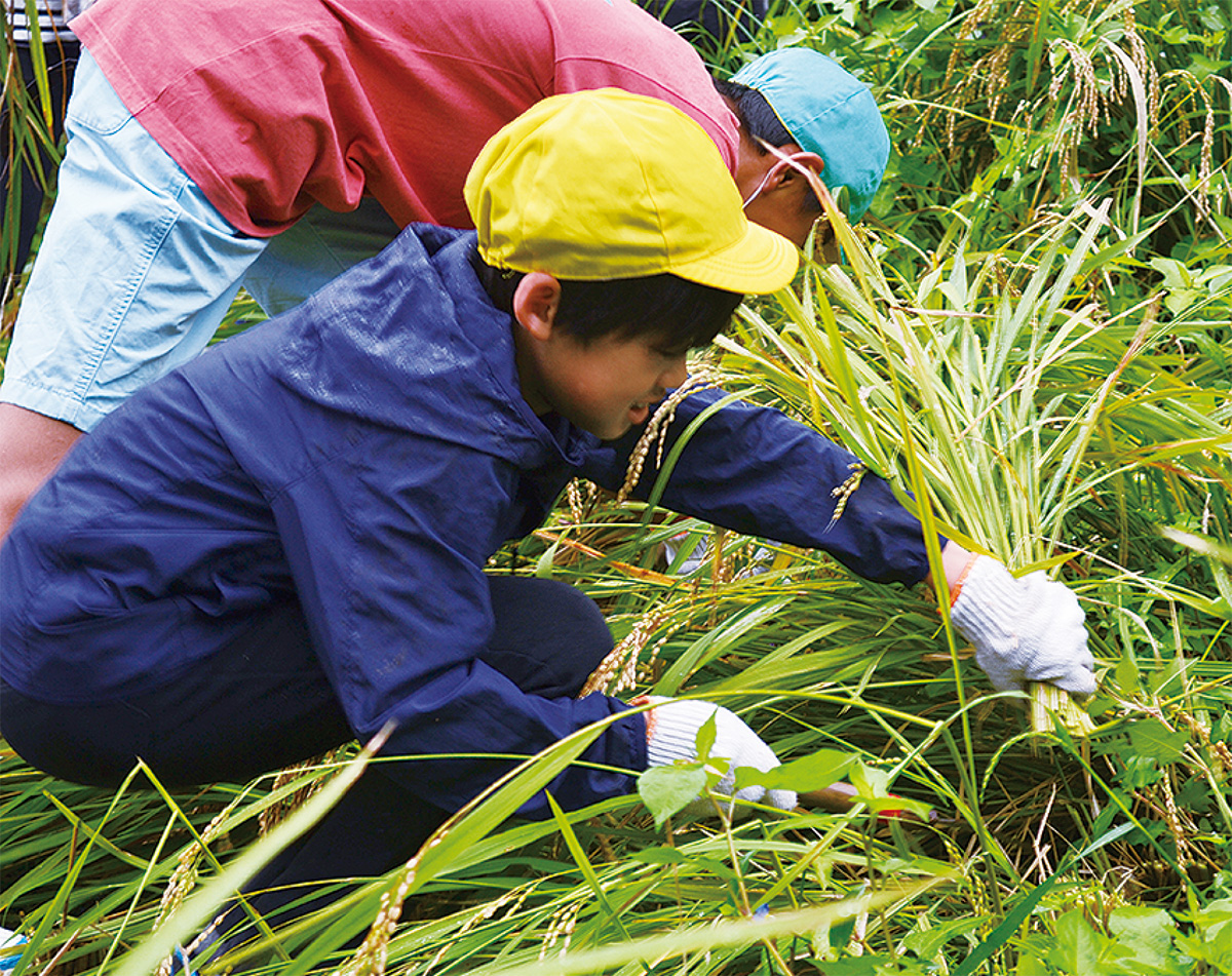 子どもたちは慣れない鎌に苦戦しながら無我夢中で稲を刈り取っていった。参加した板垣聖莉(ひじり)さんは「里山の原風景も楽しみながら作業できた」と笑顔を見せた。指導を行う同法人の天白牧夫代表は「復田から行う学校は珍しい。この地区では唯一の田んぼなので大切に管理していってほしい」と話した。