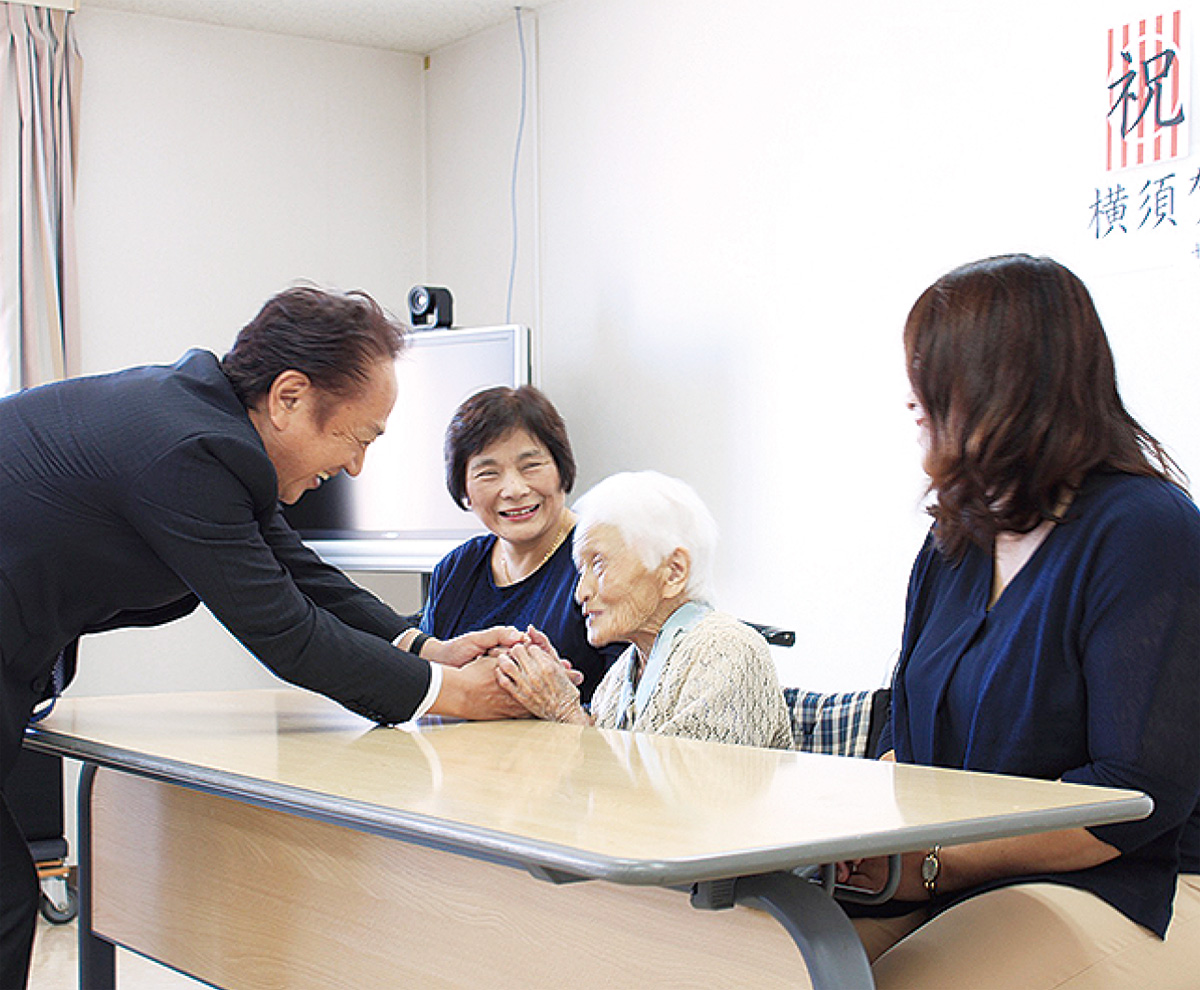 9月の「敬老の日」に際し、横須賀市は市内の高齢者に向けて、慶祝訪問を行っている。先月28日には、上地克明市長と木下憲司市議会議長らが長井にある特別養護老人ホーム「サニーヒル横須賀」を訪れ、嘉山壽萬子さん(107歳)の長寿を祝った。嘉山さんは市内で4番目の高齢。市長は「長生きの恵みを分けて頂き、ありがたい。これからも元気で過ごしてほしい」とお祝い=写真。木下議長からは好物のプリンを手渡され、満面の笑みを見せ「ありがとう、うれしい」と語った。