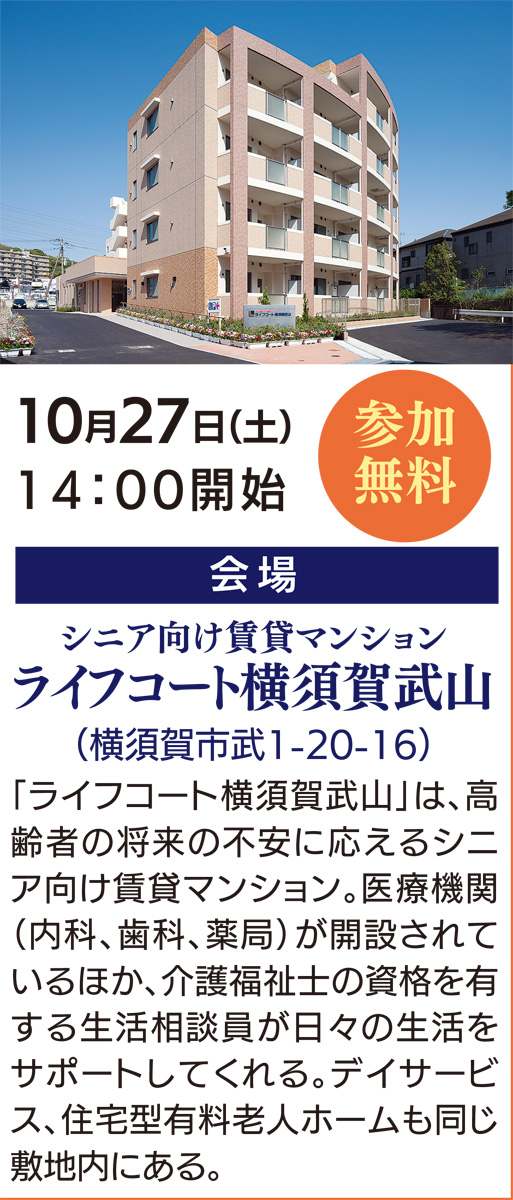 全国規模で介護施設を運営している創生事業団では10月27日(土)、「シニアの暮らし方」をテーマにした無料相談会を開く。会場はシニア向け賃貸マンション「ライフコート横須賀武山」(武1の20の16)。
