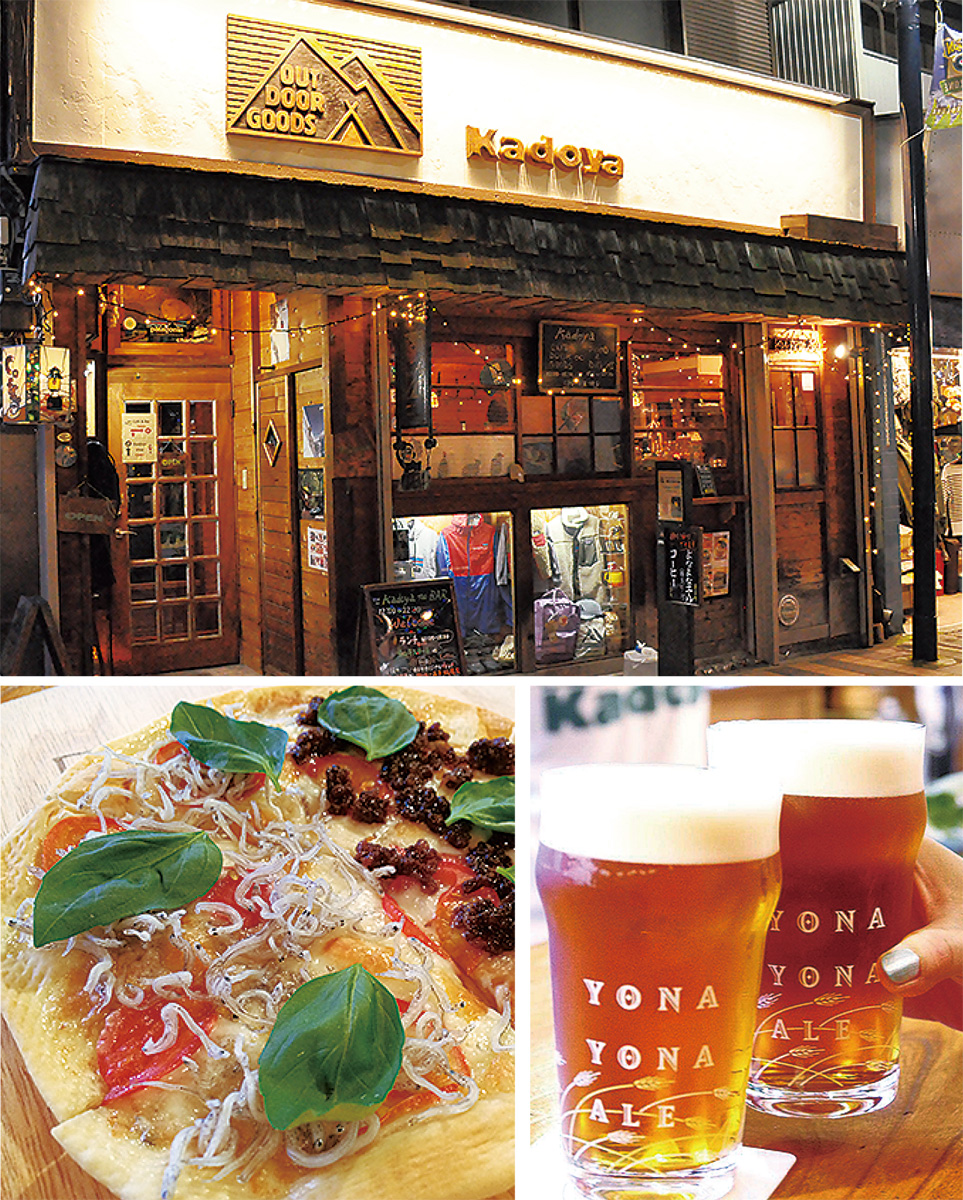 「どこかで飲んで帰ろうか」―。それなら、ドブ板通りにある「Kadoya」を推したい。山小屋のようなたたずまいの同店は2つの顔を持つ。一つはアウトドアショップ。もう一つが、地物を使った創作料理と酒を楽しむバールだ。