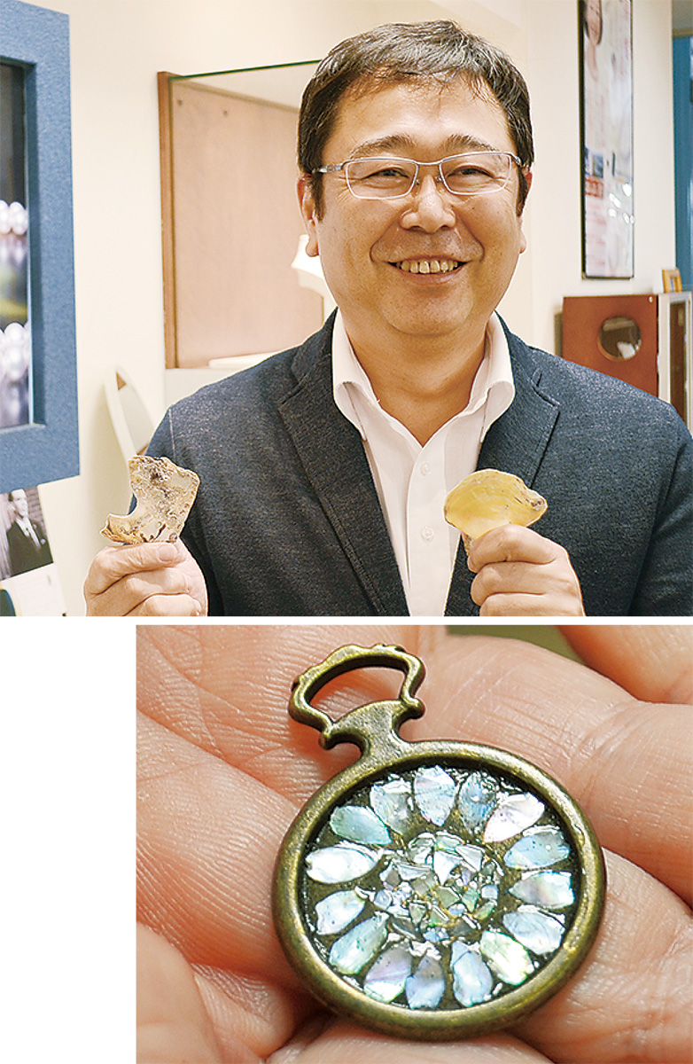 2年ほど前、同科学部がアルミホイルで人工ルビーを作っていることを知った同店代表の佐々木康晴さんが「ペンダントを作れないか」と提案したのがきっかけ。今年に入って、三浦市にある東京大学三浦臨海実験所を見学する機会があり、同所の教授から「真珠の養殖で余った貝殻を何か使えないか」と持ち掛けられた。同科学部の顧問と相談し、貝殻の内側の光沢を利用した伝統工芸・螺鈿細工に加工することを思いついた。