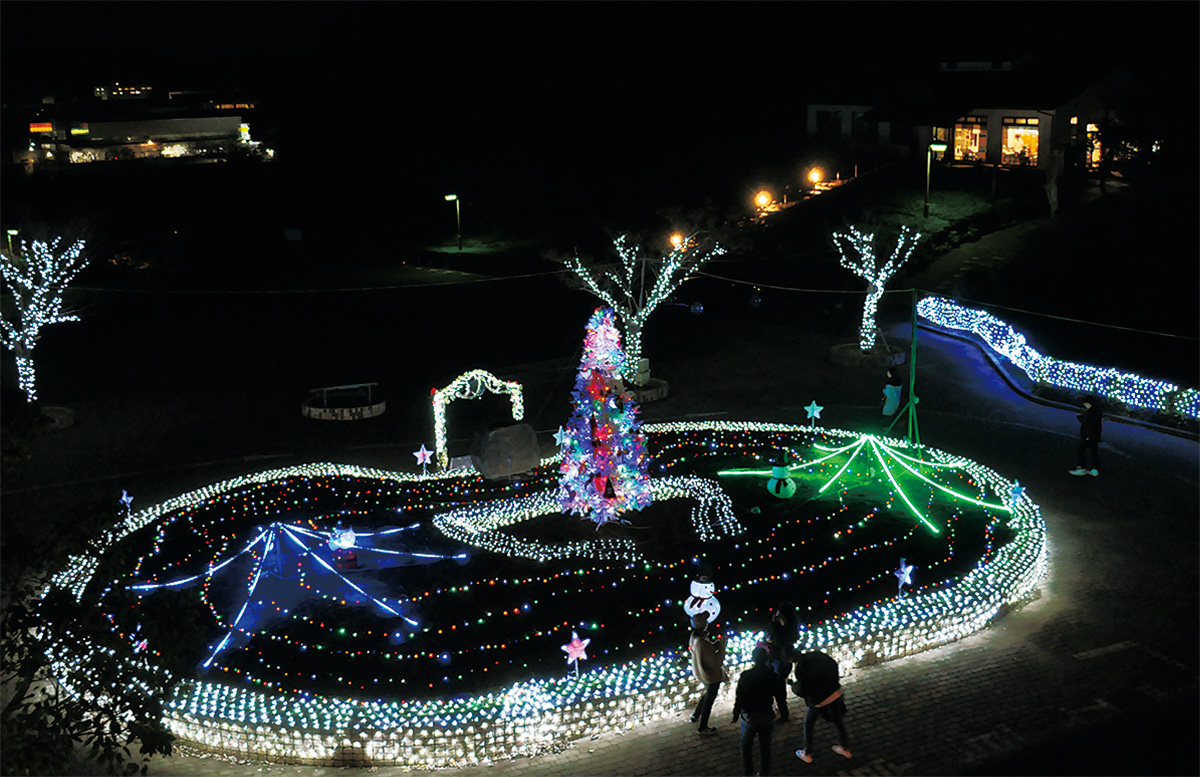神明町の「くりはま花の国」でクリスマスシーズン恒例のウインターイルミネーションが始まった。正面ゲート付近の円形花壇が装飾され、12万球のまばゆい光が幻想的な空間を作り出している。4mのツリーも登場、来訪者を出迎えている。