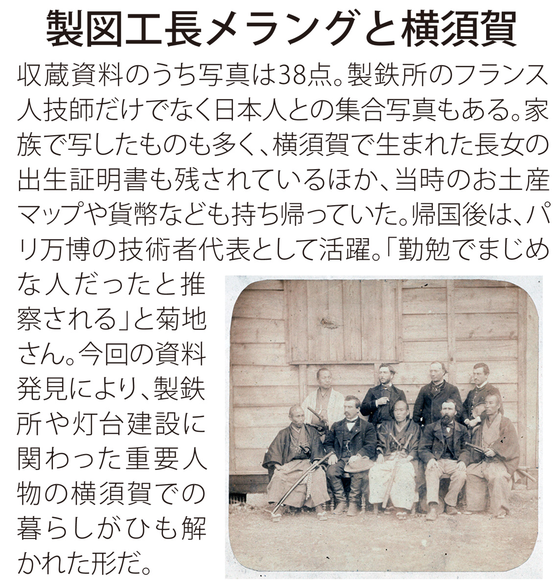 横須賀に関連したメラングの資料が現地で見つかったのは昨年のこと。子孫に伝来していたもので、フランス人研究者が「ゆかりのある町で収蔵するのが望ましい」として当市に声を掛けたという。その内容は、ヴェルニーがメラングに送った製図責任者としての雇用契約書や製鉄所の全体意見書(規則書)のほか、滞在中の日記、写真、メラング本人の名刺など71点。市は「製鉄所の歴史を伝える貴重な資料」として今年度予算690万円で購入、所蔵することになった。