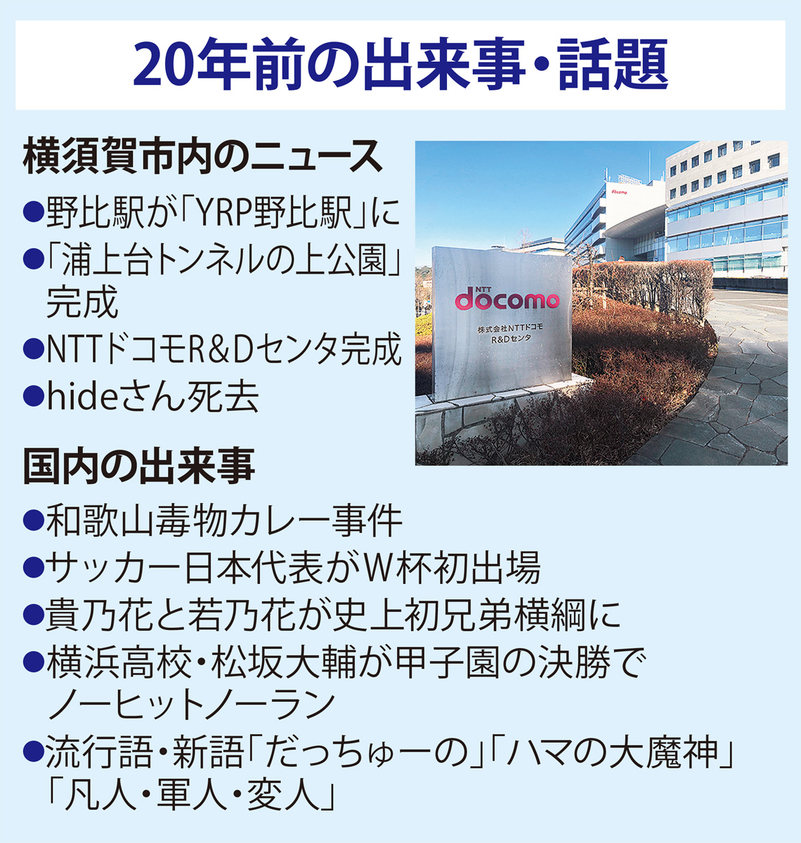 新成人が生まれた20年前の横須賀では、野比駅が「YRP野比駅」に改称したほか、モバイルコミュニケーション専門の研究所「NTTドコモR&Dセンタ」が完成するなど、ICT技術の研究開発拠点としてYRPが本格的に動き始めた。その他、ワークショップ形式で市民の声を取り入れた「浦上台トンネルの上公園」が完成したのもこの頃。また、市内出身で、人気ロックバンド「X JAPAN」のギタリストhideさんがこの世を去り、全国のファンが悲しみにくれた。