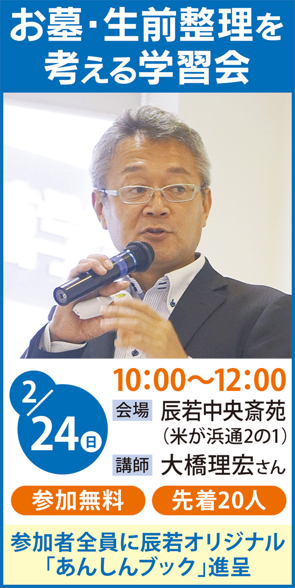 2月24日(日)は「お墓・生前整理」をテーマにした学習会を開く。講師は平作の大橋石材代表で、全国の墓にまつわるセミナーなどでも活躍する大橋理宏さん=写真。「『墓終い』の必要性の確認や事前に行うべき家族との確認事項などを扱う。今後家族と話し合う材料にしてもらえれば」と話す。当日は参加者からの質問や要望に応じてアドバイスも行う。また希望者には葬儀費用の割引に加え、日々の暮らしに役立つ特典が付く、辰若の入会キャンペーンを案内する。