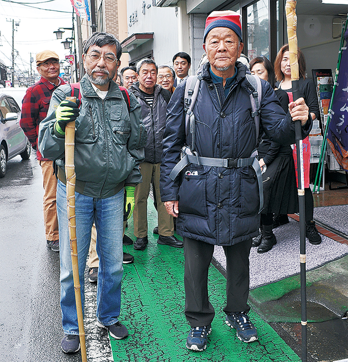 竹製の杖に記されているのは「三浦按針を大河ドラマに!」との一文。これを手に、長崎県平戸市まで歩く計画を遂行しているのは吉倉町在住の田口義明さん。「按針ゆかりの地を訪ねて」と題して、徒歩で平戸まで向かうのは今回で4回目。「年齢的なことを考えるとこれで最後だろう。按針の功績を広めて、大河ドラマ化の機運醸成に役立てば」と話す。