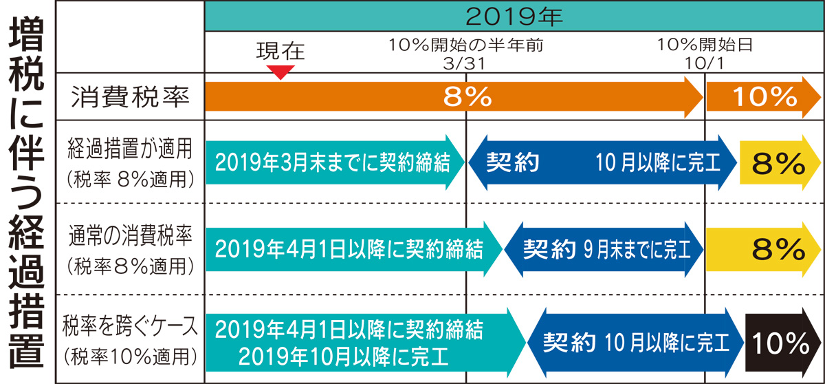 8%が適用されるのは、2019年3月31日までの契約、または9月30日までに工事を完了した場合の2通り=下図参照。期日までに申し込めば、引き渡しが10月以降でも増税前の税率が適用される。「経過措置を正しく理解し判断材料に」と、大津にある塗装専門業者エスユープレイスの佐久間太貴社長は呼びかける。