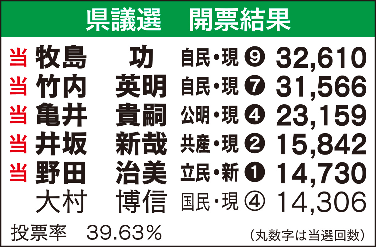 牧島氏は前回に続くトップ当選。県議会で現職最長の9期目を務める。「昭和・平成・令和と3つの時代を第一線で活躍できることを誇りに思う」とコメントした。