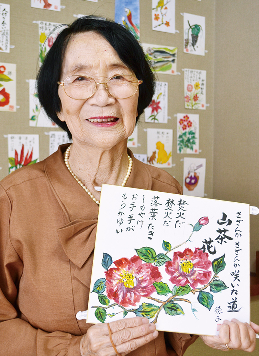 大正14(1925)年生まれで、90歳近くになって始めた絵手紙調の水彩画。当初は知人に送ることを目的にしていたが、写真などを見ながら季節の花や果物、時候の様子、愛犬の姿を描くうちに、いつしかそれが日々の楽しみになっていた。絵に留まらず、好きな言葉を添えたり、書にも挑戦。色づかいや配置のバランスなども工夫しながら描き上げる。全くの独学ながら、本格的に始めて4年、その数は1000点近くに上る。「目に入って”描きたい”と思ったらすぐに筆を手にする。そうしているうちに増えてしまって」と坂本さん。「絵からあふれる元気な姿を多くの人に見てもらっては」と家族の勧めで今回、自宅での無料展示を企画した。作品はリビングや階段の壁の一面にずらりと並ぶ。