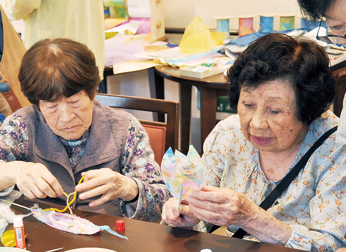 和紙や毛糸などの身近な素材で「羽根」をつくり、これを集めて「翼」に仕立てるワークショップが今月25日、久村の有料老人ホーム「SOMPOケア ラヴィーレ久里浜」で行われ、入居者と近隣住民約70人が参加した。