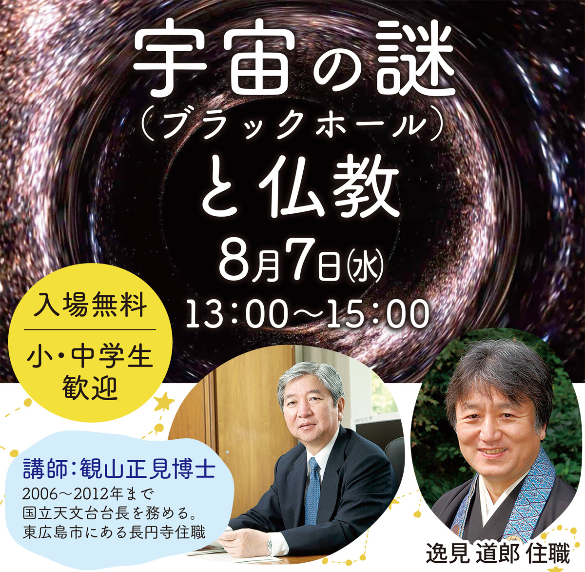 宇宙と仏教―一見、まったく違う分野に見えるが、「天文学の宇宙理論と仏教の世界観には、深く通ずる部分がある」と観山さん。公開講座は昨年に続き2回目で、先ごろ国際研究チームが撮影に初めて成功した「ブラックホール」にまつわる話題を交えて、宇宙の謎を分かりやすく解説する。講演後は、逸見住職との対談もある。