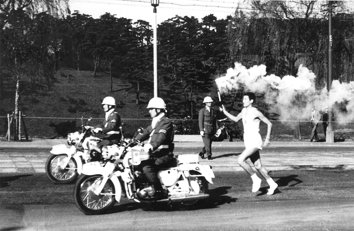 「当日のことは、いまでも鮮明に覚えています」。何回か現地で練習し、周囲からは「格好よく走れよ」との激励の声。そして10月10日、自分に与えられた区間は桜田門から三宅坂までの第2区。「親戚や大津の女子高生の顔も見えた。白バイの後に続いて、お堀端を気持ち良く走れた」と回想する。トーチの重さは約1・3kg。持ち手が下がらないように掲げながら走る――。第3走者に渡り、文字通り「肩の荷が下りた」というのが率直な感想。その後、聖火台に灯す最終走者を務めたのは、広島に原爆が投下された日に生まれた坂井義則さん(早稲田大)だった。