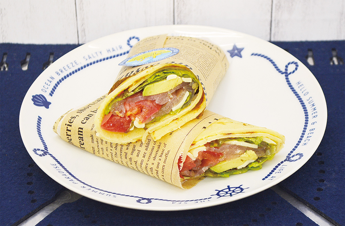 参加したのは同校海洋科学科水産食品系列の有志3人。考案したメニューの名前は「カジキの甘蜜ブリトー」=写真下。同校の船舶運航コースが実習で漁獲した「クロカワカジキ」と、平塚・大磯で収穫される神奈川ブランドの「しょうなんトマト」など県産品を小麦粉の生地で包み、ブリトーに仕上げた。カジキは、生の状態では臭みがあるため、塩漬けして燻製に。”生ハム風”にすることで、臭みをなくしつつ生の食感を楽しめるよう工夫した。ポイントは三浦産の蜂蜜。カジキのしょっぱさと対比効果を生み甘味がより引き立つようになるという。