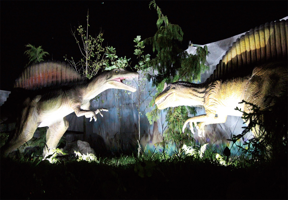 恐竜パークは、ティラノサウルスやブラキオサウルスをはじめとする大型恐竜ロボットと多種多様な植物で三畳紀・ジュラ紀・白亜紀の時代風景を表現。日本を代表する造園家の金井良一氏が会場演出を手掛けている。