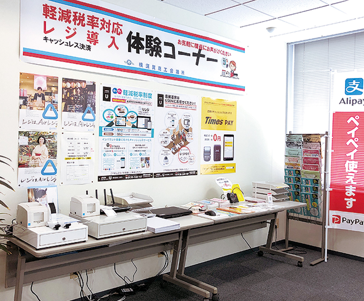 軽減税率対応のレジシステムやキャッシュレス決済が可能なPOSレジの実機を同所で展示。体験コーナー=写真=で実際に触れることができる。軽減税率補助金の概要や申請手順、ポイント還元事業なども紹介している。