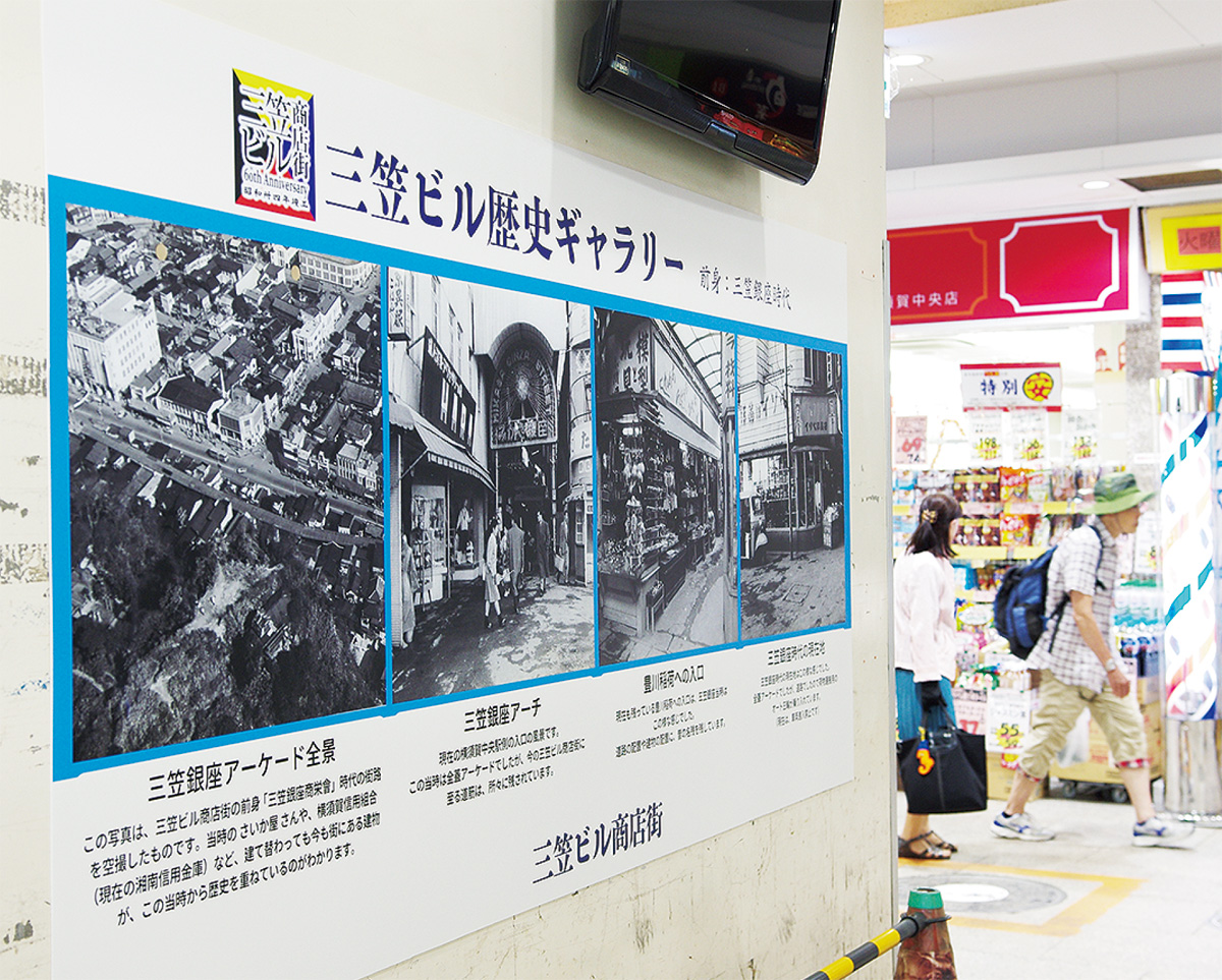 横須賀中央の三笠ビル商店街で商店街の変遷を伝えるパネル写真の展示が行われている=写真。