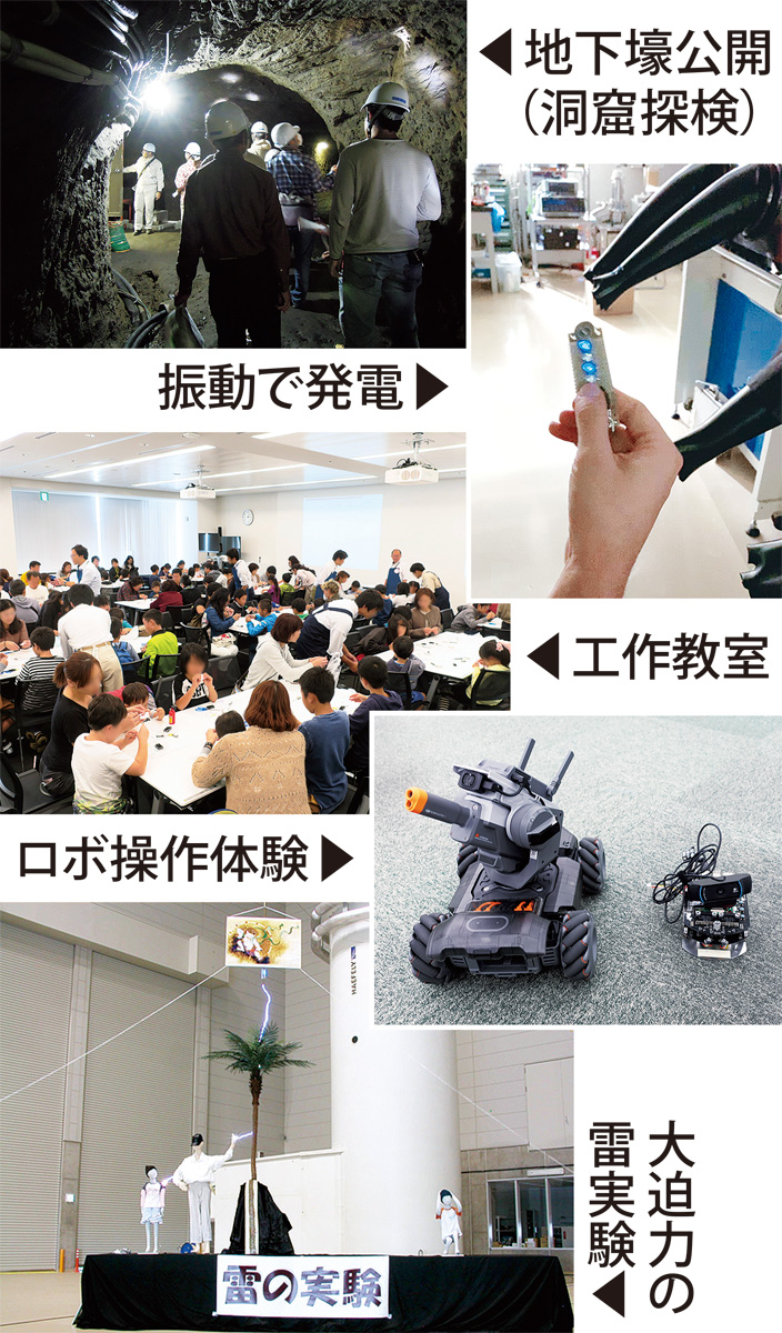 工学・理学・社会科学など幅広い分野の研究活動を一般にもわかりやすく紹介する。雷発生の原理を解き明かす実験やペットボトルロケットの発射体験、VRやロボットの操作体験など親子で楽しめる企画が盛りだくさん。施設内に遺されている海軍機関学校時代の地下壕の公開(洞窟探検)もある。