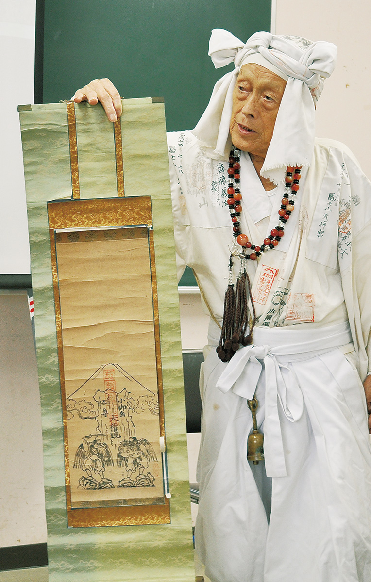今回の講座で、斎藤さんは先達の行衣(ぎょうい)の白装束を身に纏って登場。先達に与えられる「御身抜」(おみぬき)の軸装巻物を披露した。