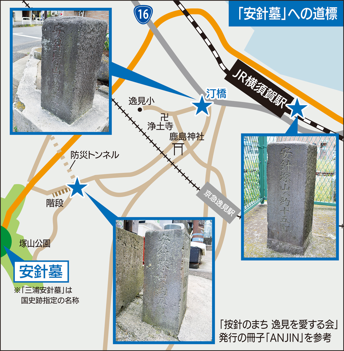 塚山公園の高台にある国史跡の「三浦安針墓」。最寄りの駅は―?と尋ねられて、すぐに答えられるだろうか。駅名から「安針塚駅」と言ってしまいそうだが、実際に現地への標識などの案内があるのは、京急の逸見駅側。安針墓を指す3つの道標(石製の道しるべ)の一つがあるのは横須賀駅だ。