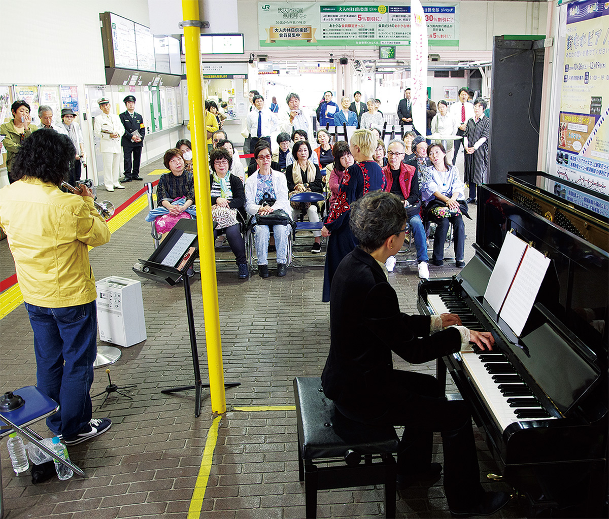 お披露目当日は80年代の音楽番組で活躍したロックバンド「TOPS」の3人のメンバーで結成される「トルマリン」が記念ミニライブを実施。駅舎内に響き渡るピアノとトランペットの音色、歌声に市民は耳を傾けていた。