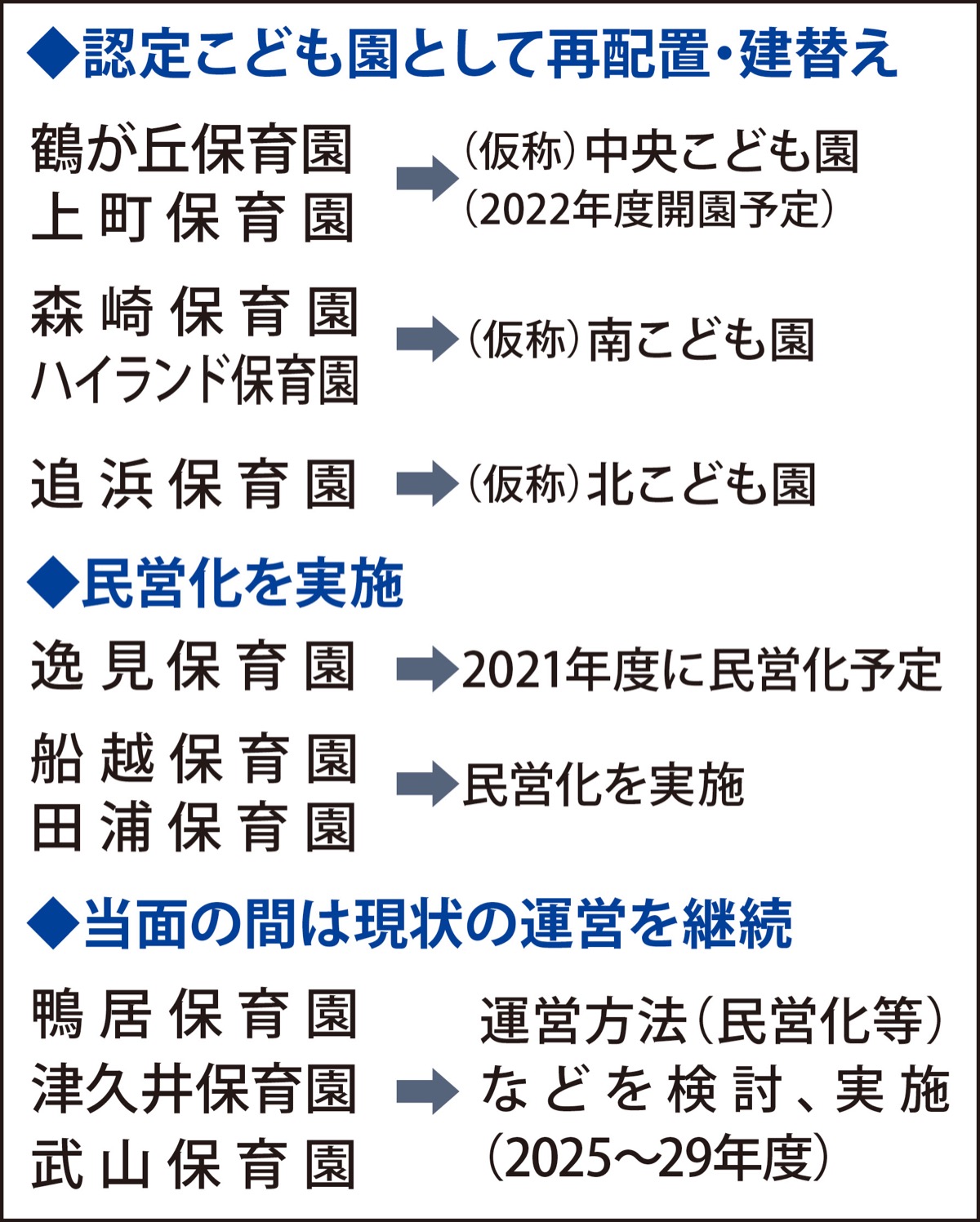 また、運営費の効率化において、船越・田浦・逸見保育園については民間事業者に運営を移行。既に逸見保育園は21年4月からの民営化が決まっている。公立園は民間(私立)保育園と比べて運営費が1人あたり1万5千円ほど高いため、民営化することでこれを削減する考え。運営効率化により生まれた財源については、施設整備や待機児童対策・職員の資質向上などの経費に充てるという。今回、これに該当しない鴨居・津久井・武山保育園に関しては、当面は現状の運営を継続する方針だという。