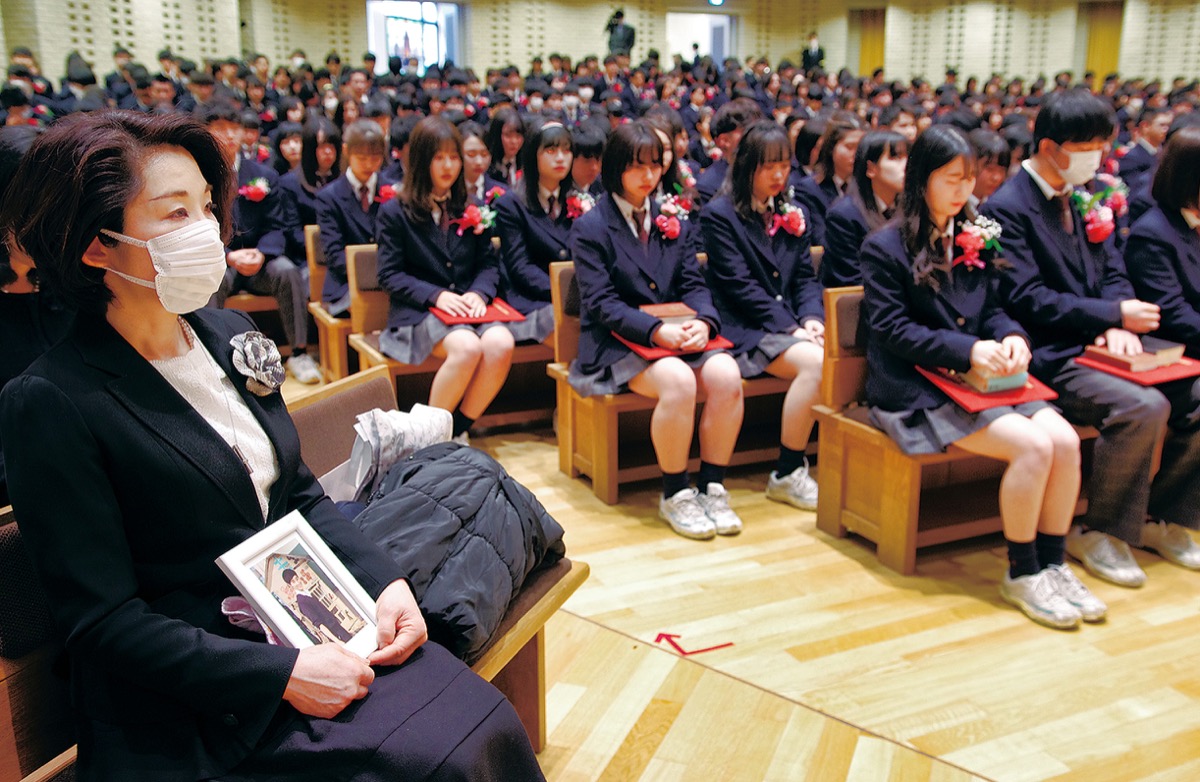 今月2日の卒業式、美和さんも崇人さんの写真を携えて出席=写真。川名稔校長は告辞で「崇人に生きる力をくれ、忘れず思い出してくれてありがとう」と美和さんの言葉を代読。崇人さんの前向きさや周りへの気遣いにも触れ、「今できることを最大限に尽くす生徒だった。皆もこれからの人生、できる限りのことを精一杯頑張ってほしい」と言葉を詰まらせながら卒業生にエールを送った。式の後、クラスメイトらが美和さんのもとへ歩み寄り、崇人さんへの思いを涙ながらに伝えていた。