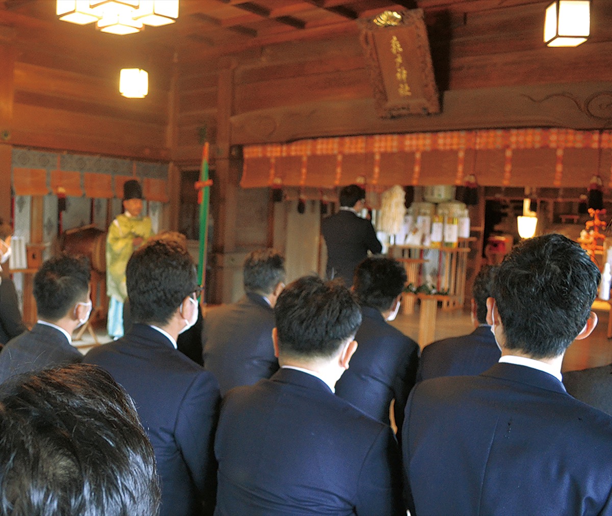 当日は、厳かな雰囲気の中、新入社員は同社役員らとともに本殿で祈願を受けた。祝詞に続き、入社する12人はひとりずつ玉串を捧げた。