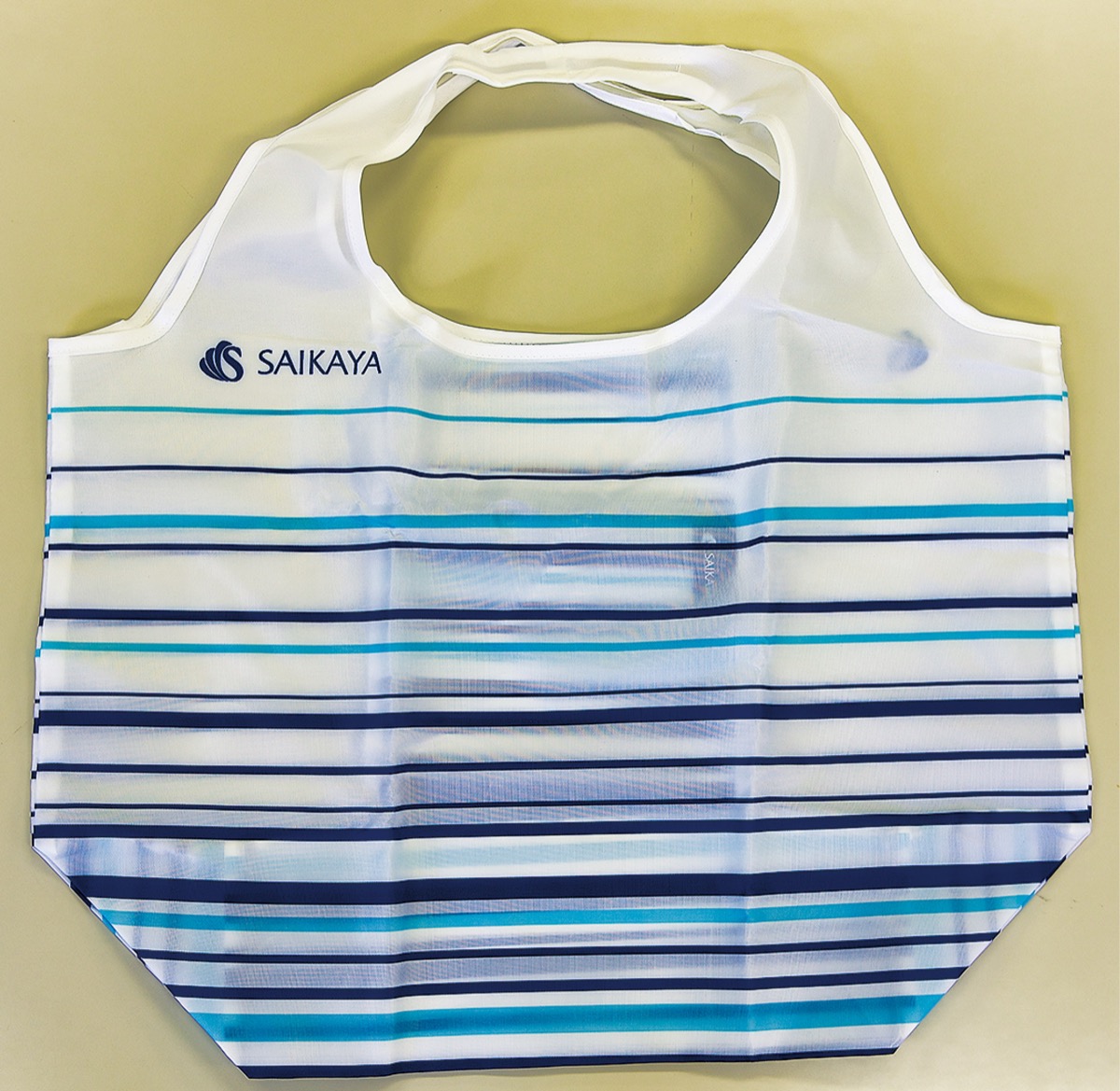 白地に青ストライプ柄でお馴染みのさいか屋の紙袋を模した特製エコバッグが誕生した=写真。