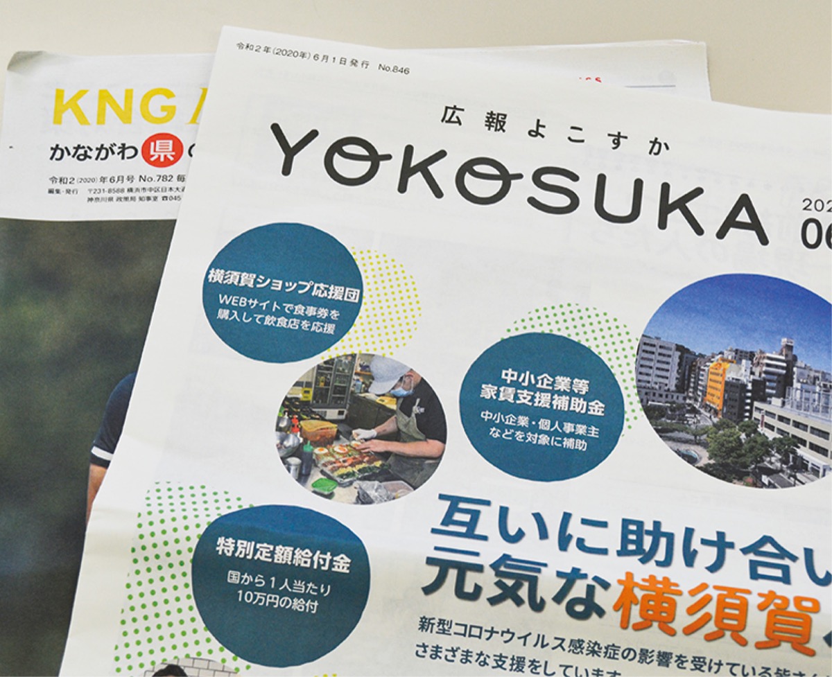 横須賀市では毎月1回、「広報よこすか」を17万6千部発行。町内会・自治会を通じて各世帯へ配布している。マンションなど町内会組織がない世帯へは、管理組合などを通じて配っているほか、市内の公共施設や病院・スーパーなどに配架している。