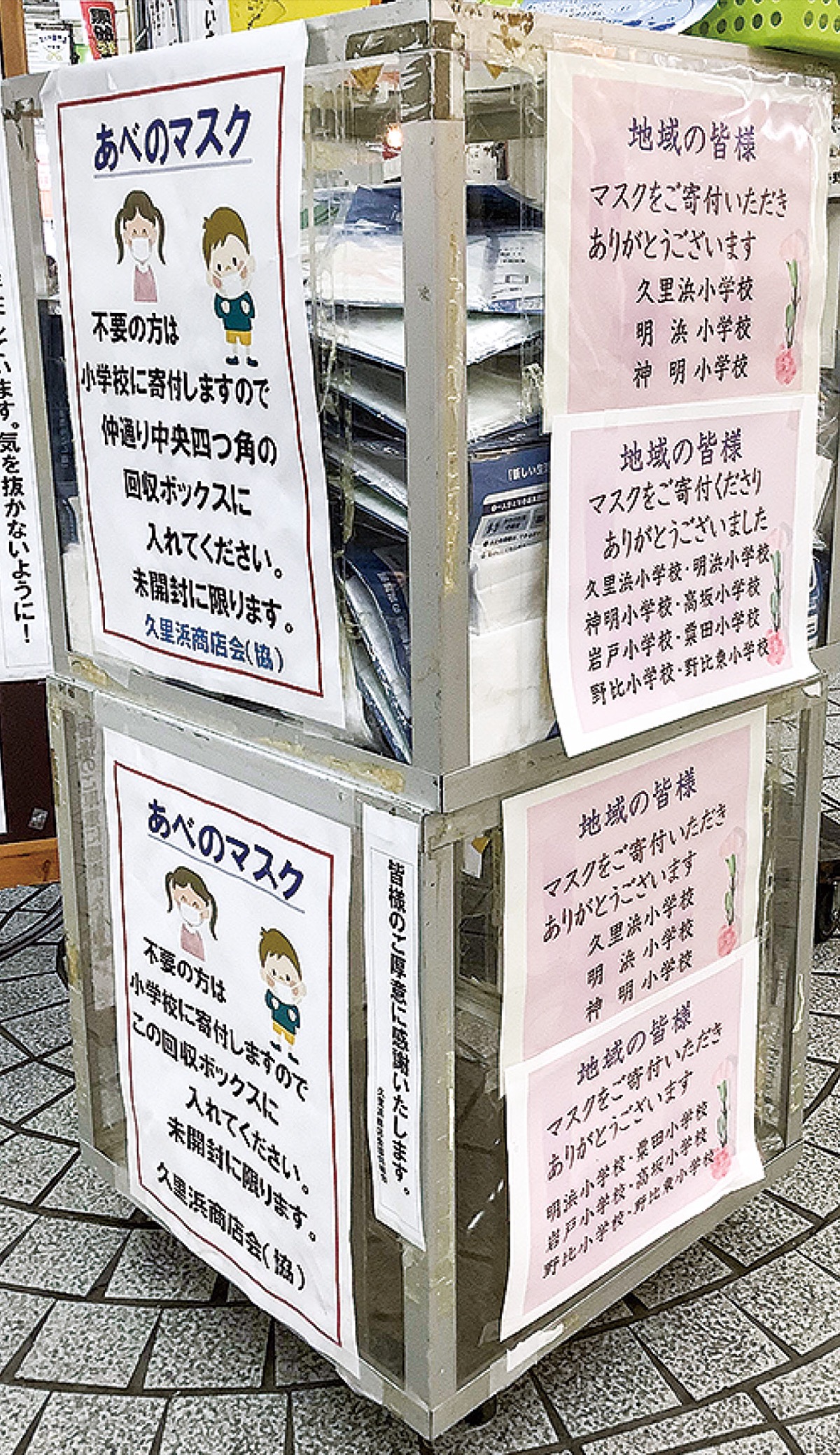 そこで同組合は「子どもにぴったりな大きさだから、学校に寄付しよう」と5月下旬、京急久里浜駅前の黒船仲通り商店街でマスクの回収を開始。1カ月半で、45cm角の回収箱に5箱分が集まり、近隣8小学校に届けた。現在も6箱目が置かれており、計2000セットを超えている。