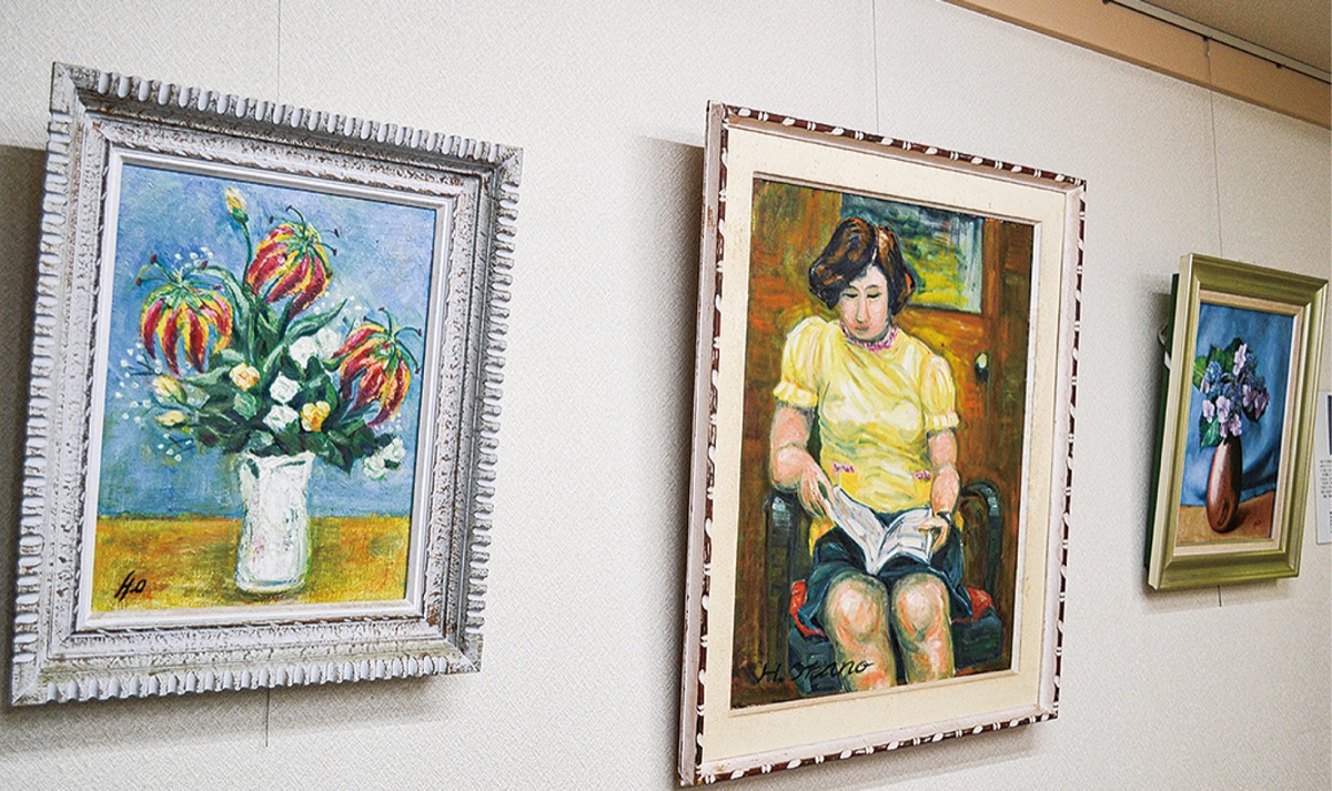 展示スペースでは、逸見地域を中心に活動する「コロボックルの会」の主催で、地域に声を掛けて企画展を実施している。現在行われているのは「岡野弘男展」。吉倉町在住で、昨年末に亡くなった岡野さんを追悼し、生前に手掛けた油絵画を11点展示する(9月末まで)=写真。