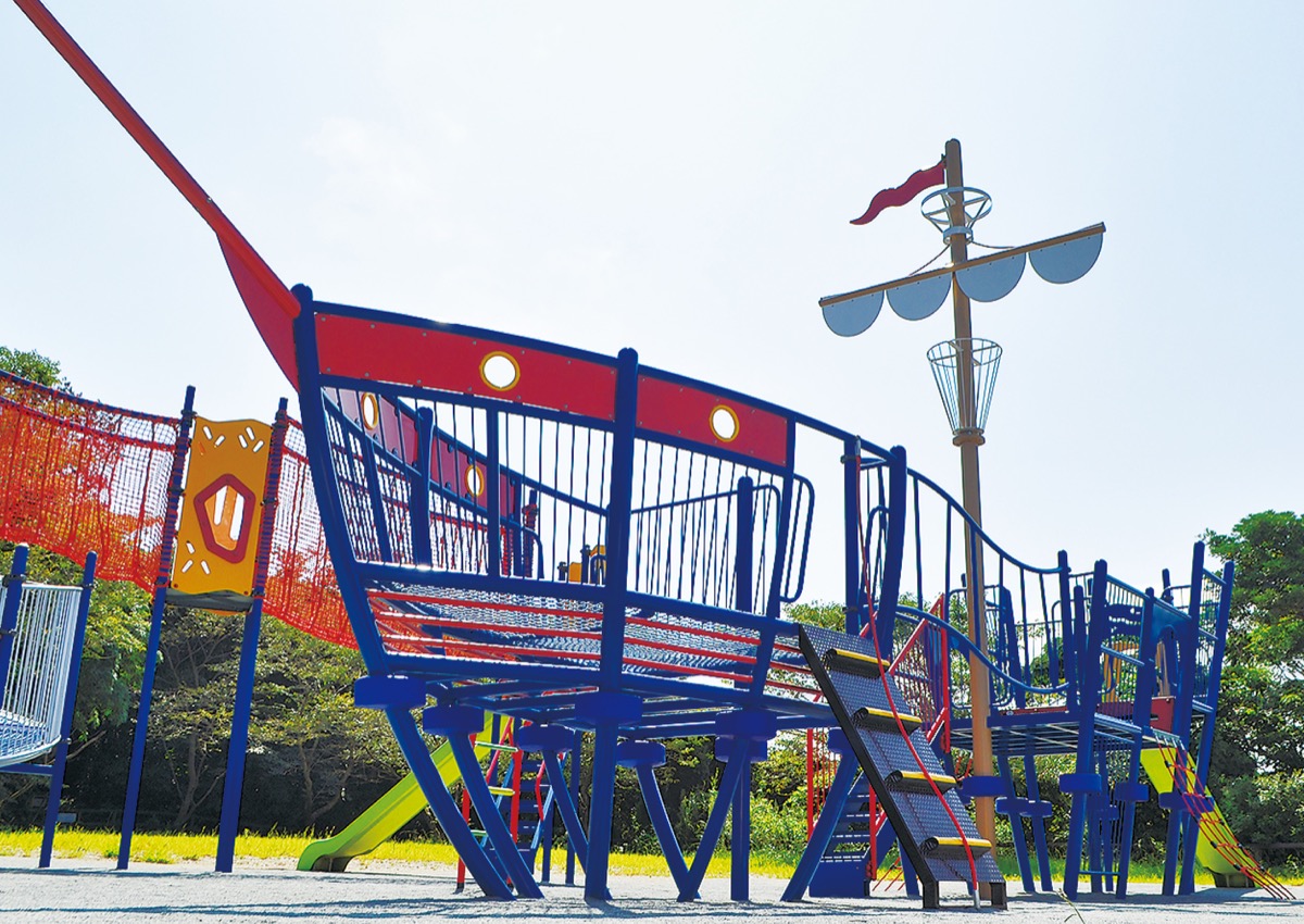 設置されたのは巨大なゴジラ滑り台の背後あたり。「海の王国」をテーマに、でこぼこした滑り台やロープのアスレチックのほか、丘の斜面を登りきると船の形をした遊具が現れ、乗り込んだ先からは横須賀の街並みを眺めることができる。