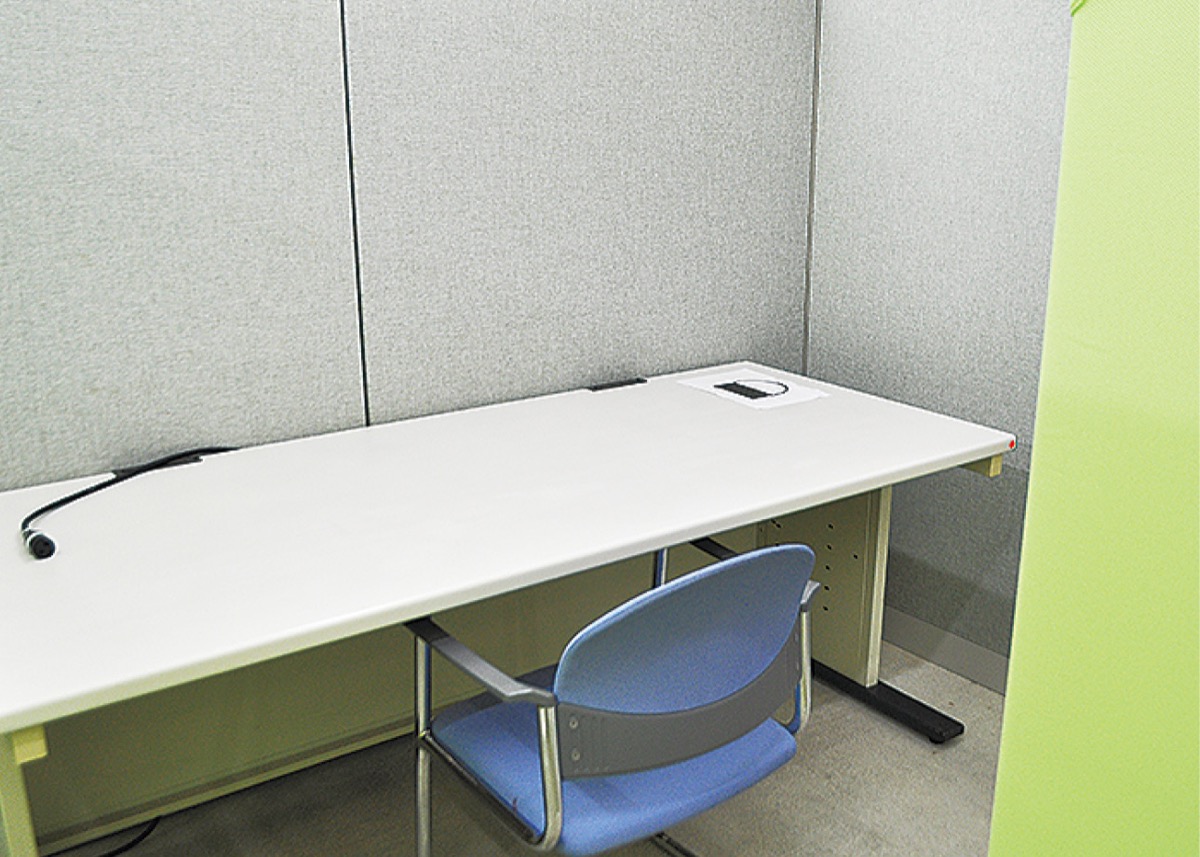 会議室や研修室があり、地域の産業振興の交流拠点として利用されている同プラザ。ロビーにある既存の情報図書コーナーとフリースペースの一部をパーテーションで仕切り、4つの個人用スペースを設けた。携帯電話の通話やウェブ会議、飲食も可。利用料は1時間100円で30日前から受付。複数人数の打ち合わせなどで利用できる「コ・スペース」は予約不要で利用無料、電源使用の場合は1日10円。