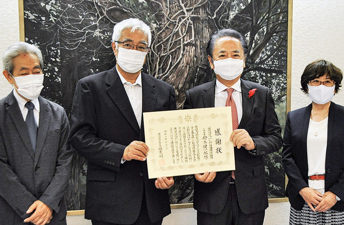 同財団はパーキンソン病の研究者支援などを目的に、2018年に設立。コロナ禍の折「地域のために何か支援ができないか」と相談し、設置に至ったという。これと合わせて、市の新型コロナの緊急対策基金への寄附も行った。今月1日には、市庁舎を訪れた鈴木代表理事らに、上地克明市長から感謝状が手渡された=右写真。