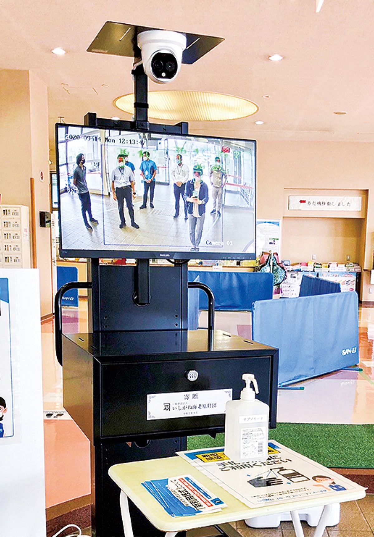 一般社団法人いしがね海老原財団(根岸町・鈴木健一郎代表理事)はこのほど、市内の公共施設へサーマルカメラ機器を寄贈した。10人以上の体温を一度に検知できるカメラとモニターで、大人数での入場が想定される場所として、総合体育会館のメインアリーナ・サブアリーナと横須賀美術館の3施設の入口に取り付けられた。