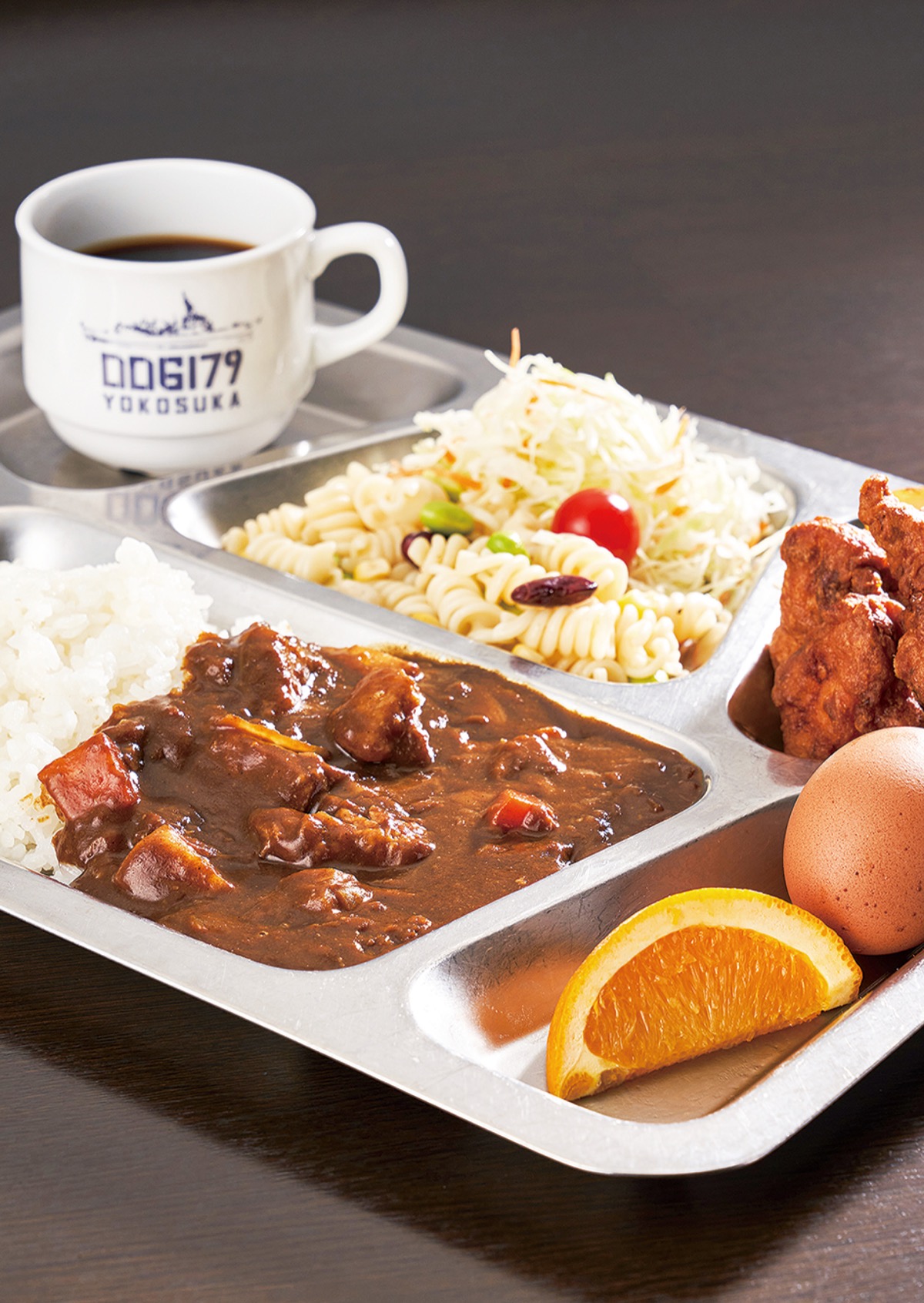 ダークグレーを基調とした店内は護衛艦の船室を想起させるデザイン。提供されるメニューも自衛隊や旧日本海軍にちなんだものばかり。艦艇や部隊で毎週金曜日に振る舞われている「海自カレー」はもちろん、航空自衛隊の各基地の給食で提供されている鶏の唐揚げ「航空自衛隊空上げ」、長期航海から母港へ入港する前日に「ぜんざい」を振る舞う旧海軍の慣わしを起源とする「入港ぜんざい」などが味わえる。
